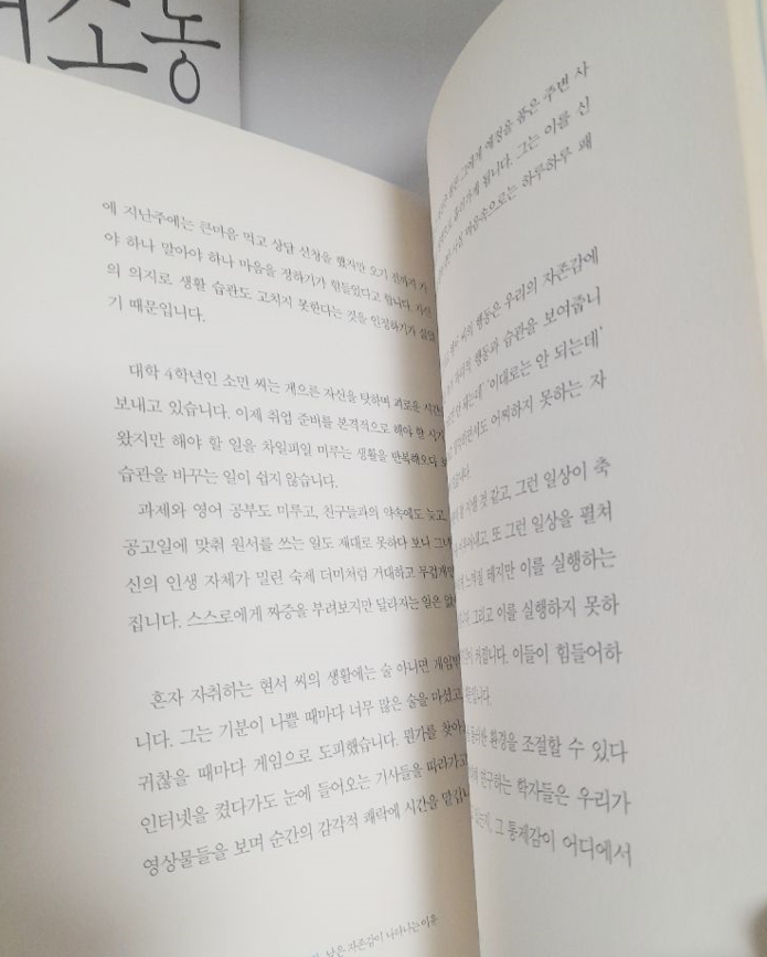 그럴 때마다 책꽂이에 꽂혀 있는 『자존감, 어떻게 회복할 것인가』라는 책이 눈에 들어왔습니다. 마치 '자존감 바닥을 치고 있다면, 이 책 좀 읽어봐!' 하고 속삭이는 것 같았죠. 하지만 동시에 '이것도 다 못 읽으면 어쩌지?' 하는 또 다른 압박감이 들었습니다. 책을 사는 것과 읽는 것 사이의 간극, 그리고 그 간극이 저의 자존감과 연결되어 있다는 사실이 답답했습니다.